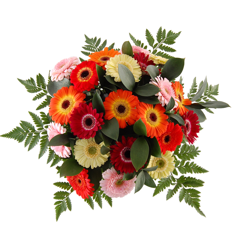 Chcesz wyrazić szacunek i uznanie lub pokazać komuś, że jest piękny? Wybierz bukiet kolorowych gerber przybranych zielonymi dodatkami. Do bukietu dołączony jest bilecik, aby wraz z kwiatami przekazać życzenia.