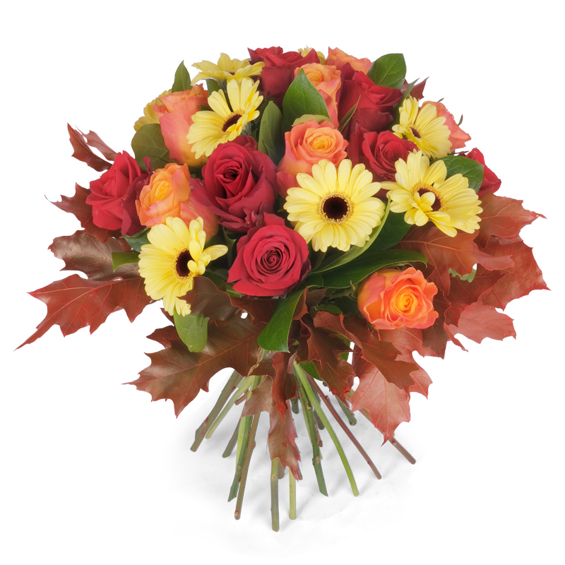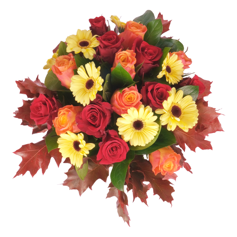 Ten bukiet to odzwierciedlenie piękna natury. „Obfita Jesień” łączy w sobie elegancję i naturalny wdzięk. Róże i gerbery prezentują się wyjątkowo w towarzystwie liści klonu. To kompozycja, która przyciąga wzrok i dodaje ciepła. Idealna na każdą okazję i dla każdego!